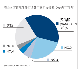 深信服科技在IDC中國發(fā)布的2010年下半年中國安全內(nèi)容管理市場(chǎng)(上網(wǎng)行為管理市場(chǎng))報(bào)告中占有率達(dá)到40%,在2009年占有率達(dá)到33.8%,蟬聯(lián)市場(chǎng)占有率領(lǐng)先。
